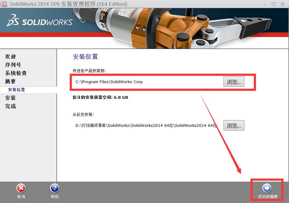 9.选择软件安装路径,然后点击“返回到摘要”