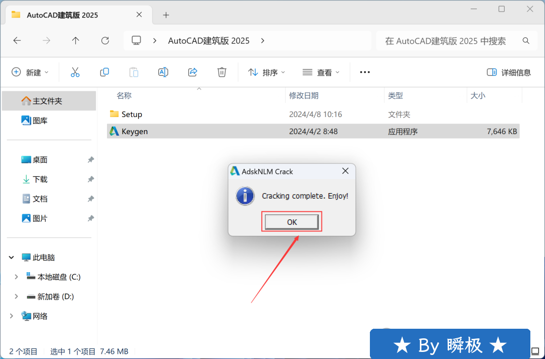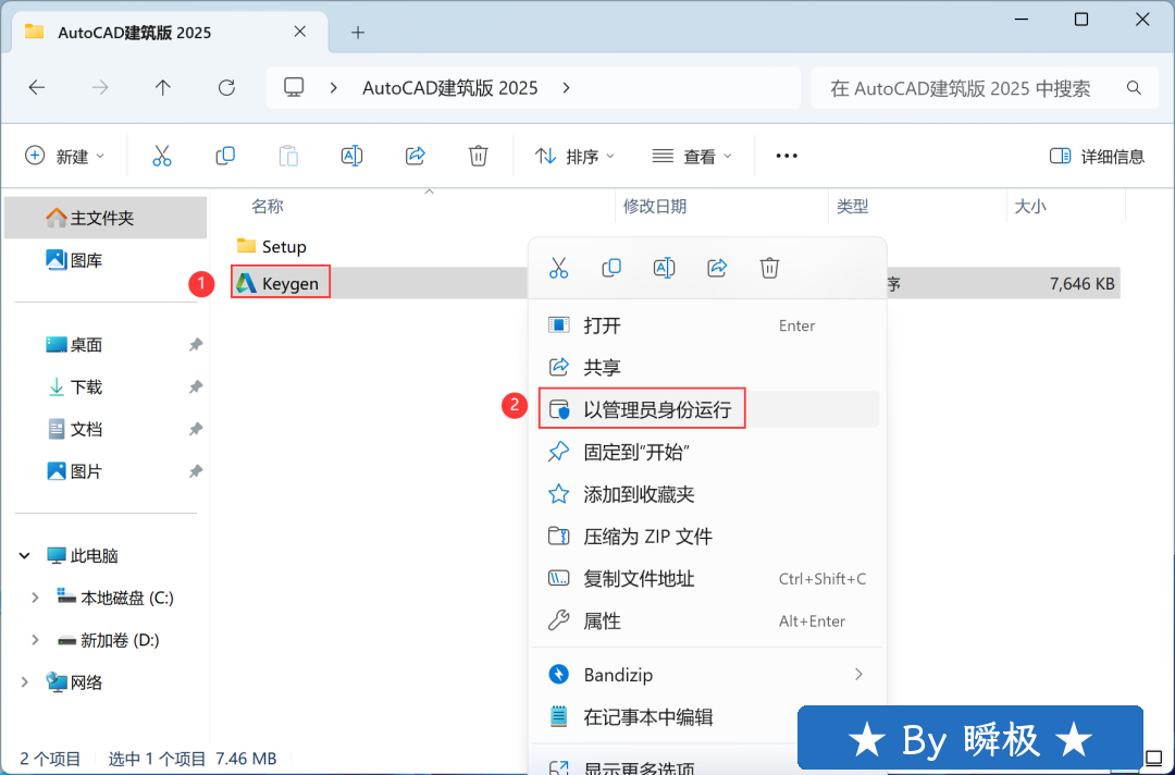 8、回到AutoCAD建筑版 2025文件夹,找到【Keygen】应用程序,右键选择【以管理员身份运行】它