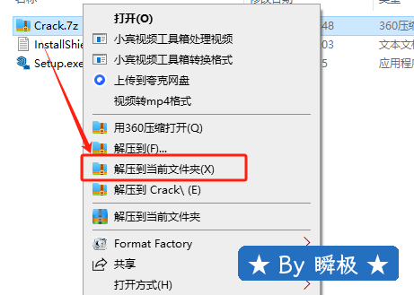 ①鼠标右击Crack压缩包②点击【解压到当前文件夹】。