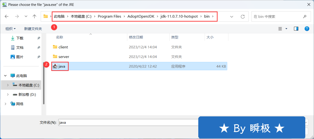 12、选择路径C:\Program Files\ AdoptOpenJDK\ jdk-11.0.7.10-hotspot\bin的【java】程序,再点击【打开】