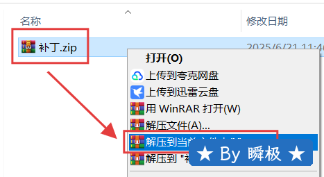 4.选中【补丁】文件,鼠标右键选择【解压到当前文件夹】。