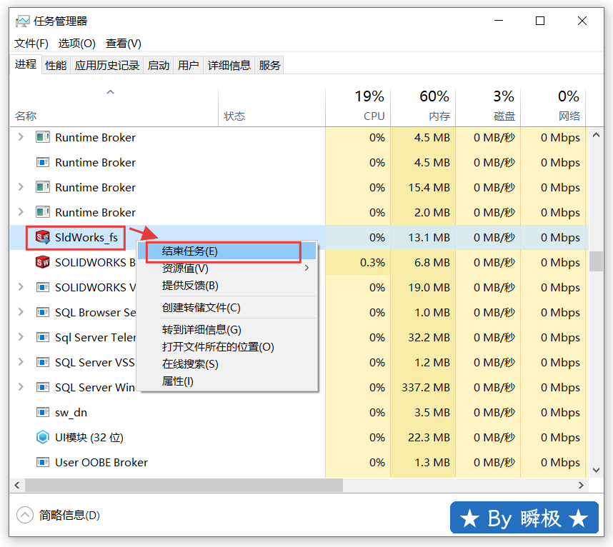 6.找到选中【SldWorks_fs】右键【结束任务】。