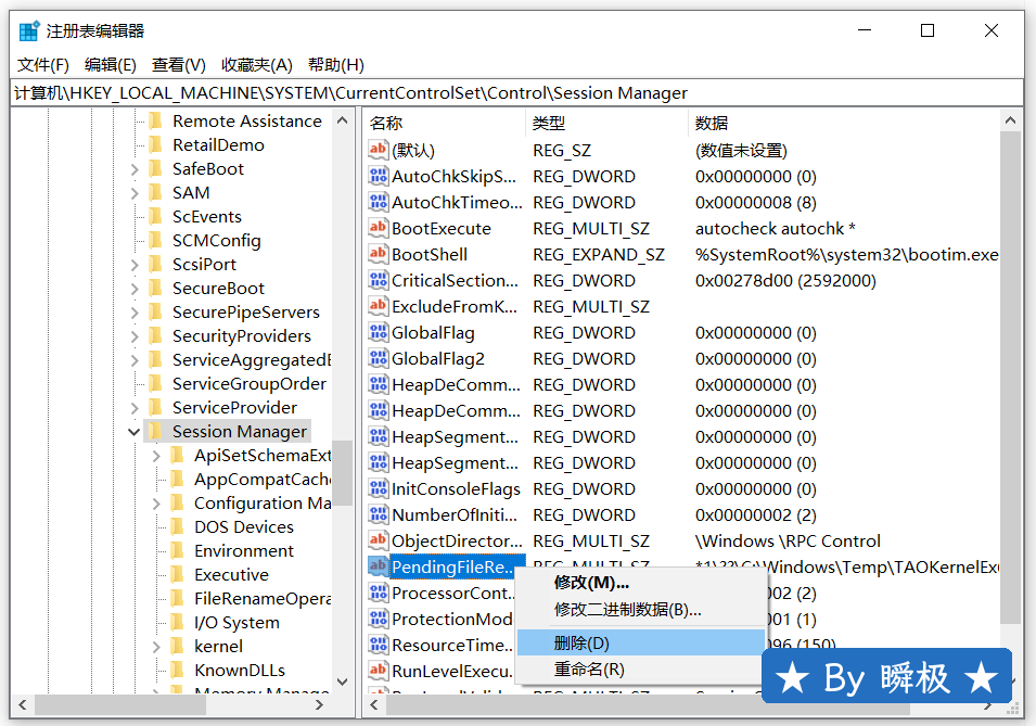 2.弹窗提示【前一个安装中的Windows重启操作正在等待处理......】 解决方法:一般可以直接跳过,如果怕后面激活出问题,Window+R 打开【运行】输入 regedit 打开注册表编辑器 ,依次展开:HKEY_LOCAL_MACHINE\SYSTEM\CurrentControlSet\Control\Session Manager然后找到PendingFileRenameOperations删除就行。