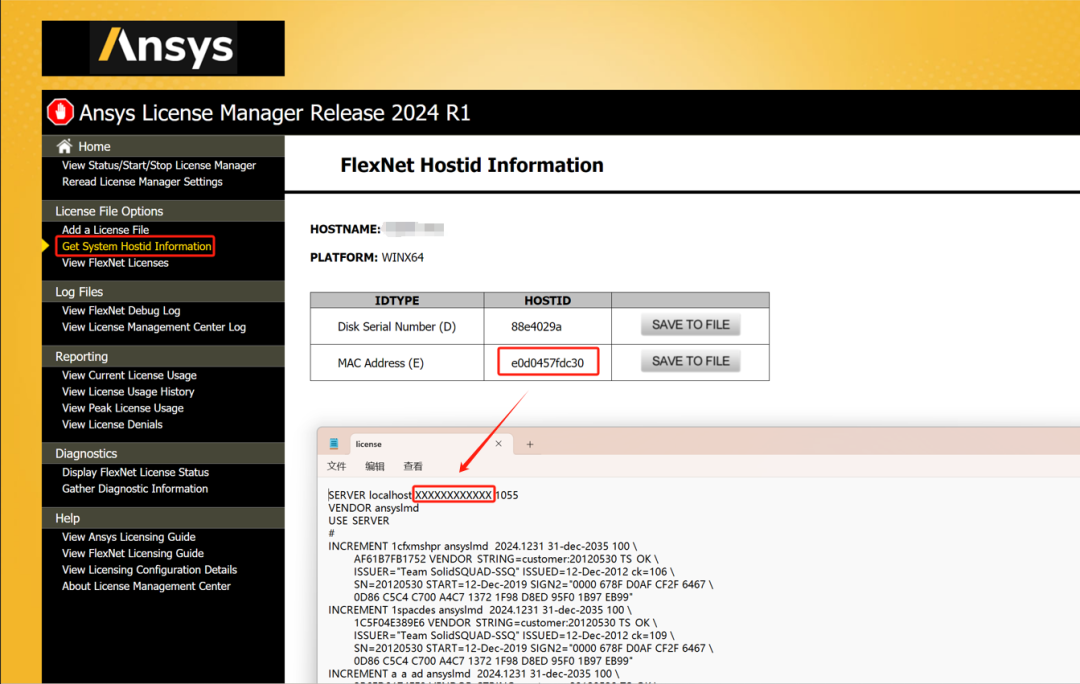 16.点击左侧 Get System Hostid Information,复制表格中的HOSTID,替换 license 中的 xxxxxx