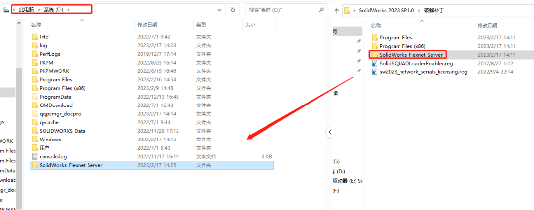 2首先就是将电脑C盘打开,然后将安装包破解补丁文件夹里面的SolidWorks_Flexnet_Server文件夹复制到C盘里面去