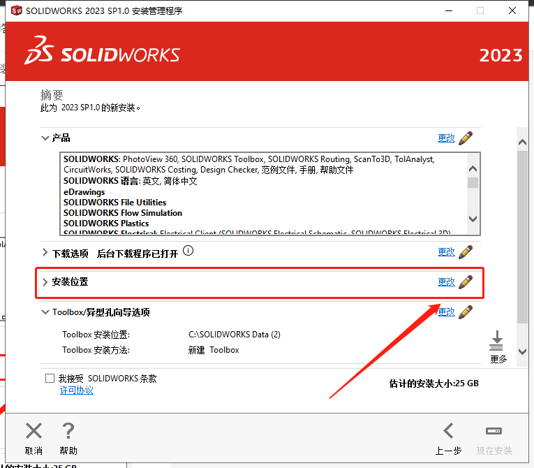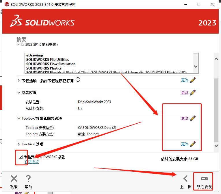 同上更改Toolbox与Electrical安装路径,勾选我接受,点击现在安装