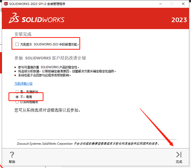 安装成功,将【为我显示…】取消勾选,选择【不,谢谢】,点击完成。