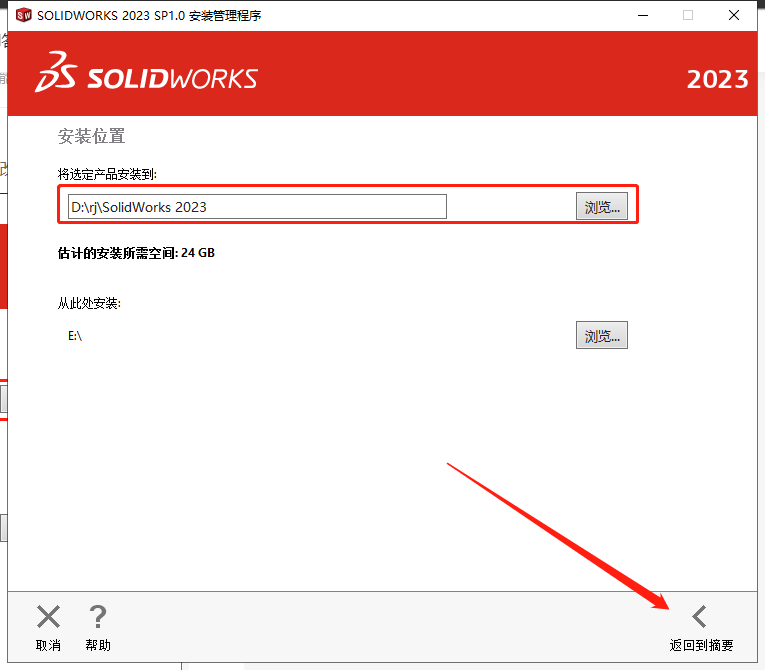 点击浏览更改安装位置,确定安装位置之后点击返回到摘要即可!