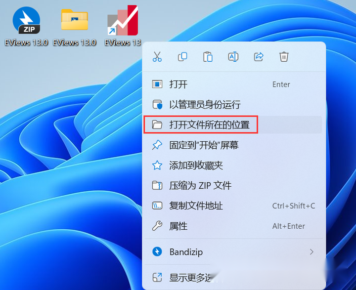 19、回到桌面,右键桌面上的【EViews 13软件图标】,点击【打开文件所在的位置】