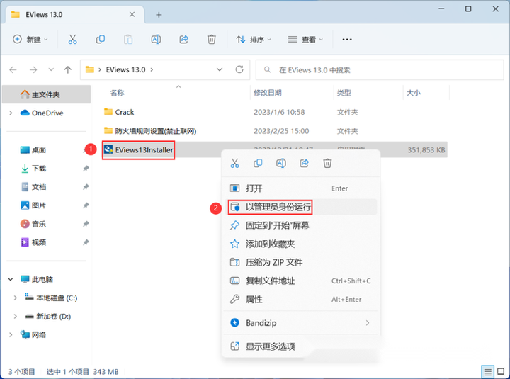 3、找到【EViews13Installer】应用程序,右键选择【以管理员身份运行】它