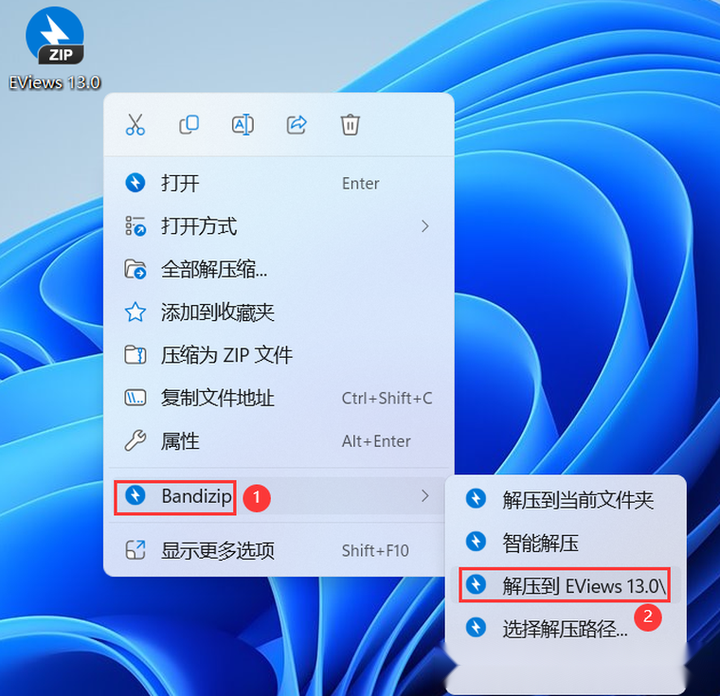 1、下载EViews 13.0软件安装包到电脑上,右键选择【解压到EViews 13.0\】