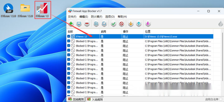 24、回到桌面,将EViews 13软件图标拖到Firewall软件的【出站规则】内