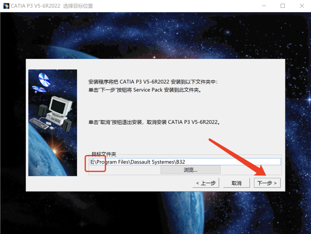 5.修改路径地址中的首字符C可更改安装位置,本例安装到E盘,点击下一步。