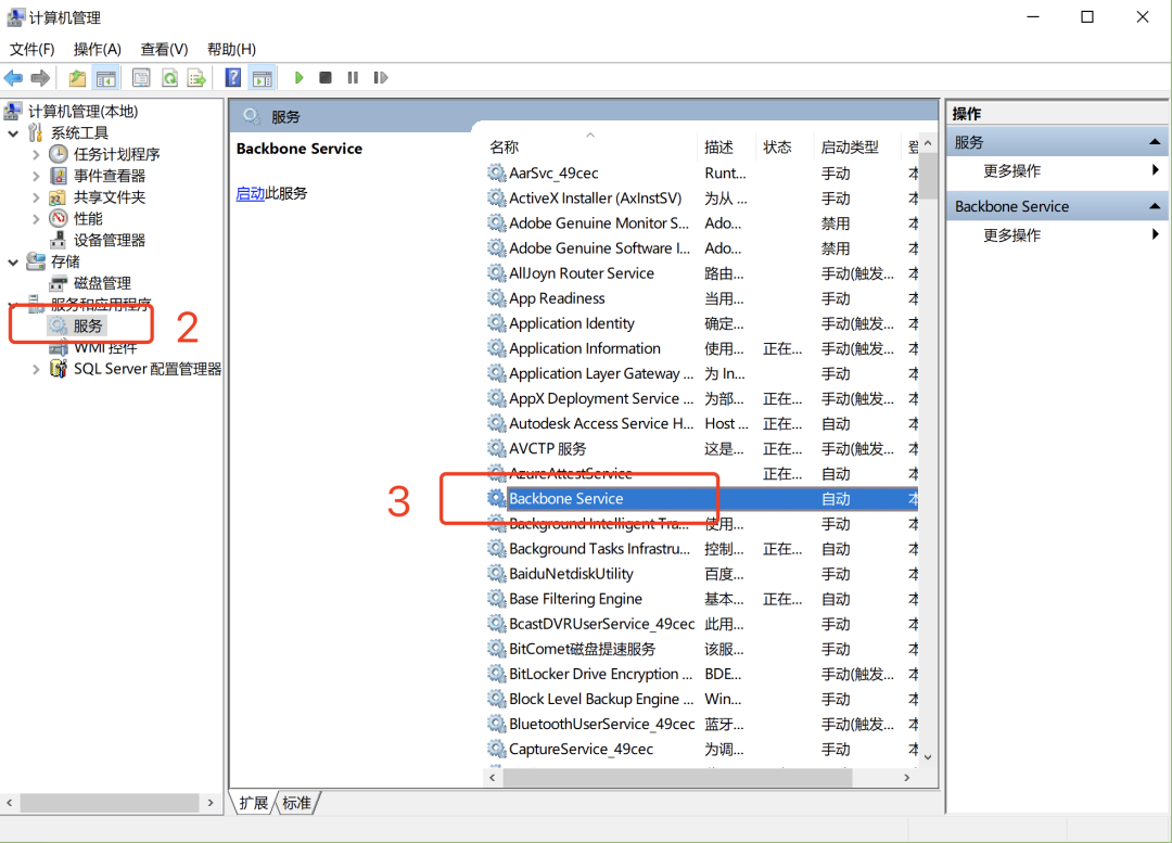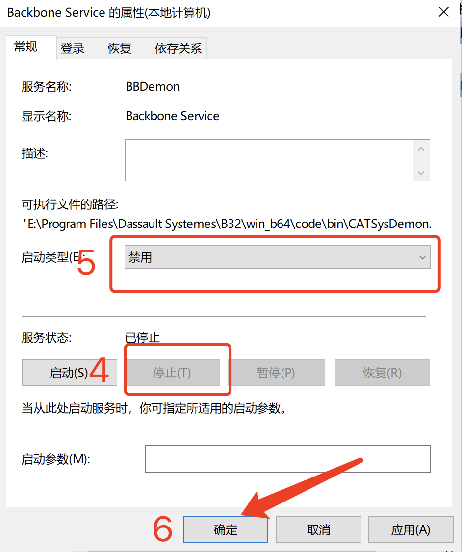 27.❶在此电脑右键选择【管理】,❷打开【服务】界面,❸找到【Backbone Service】服务项双击打开,❹点击【停止】,❺启动类型下拉选择【禁用】,❻点击【确定】。