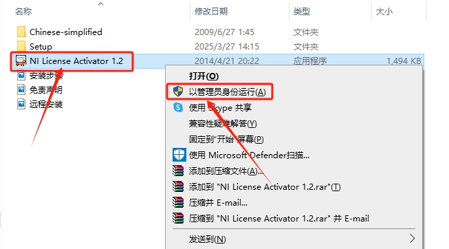 18.返回到开头解压的【Multisim 10.0】文件夹中,鼠标右击【NI License Activator 1.2】注册机,选择【以管理员身份运行】。