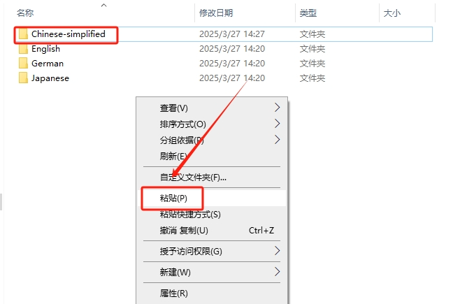 29.在打开的文件夹空白处,鼠标右击【粘贴】刚才复制的Chinese-simplified文件夹。