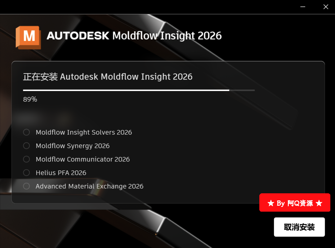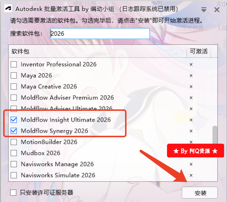 13.根据安装的软件勾选相应的项,教程这里勾选“Moldflow Insight Ultimate 2026”和"Moldflow Synergy 2026",点击“安装”