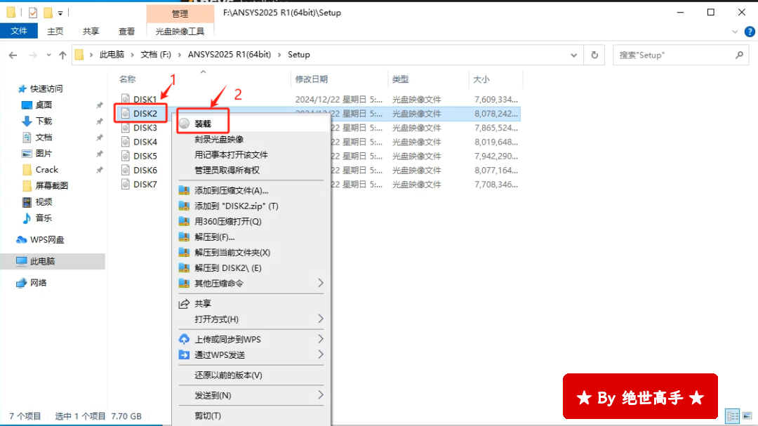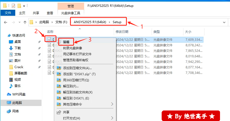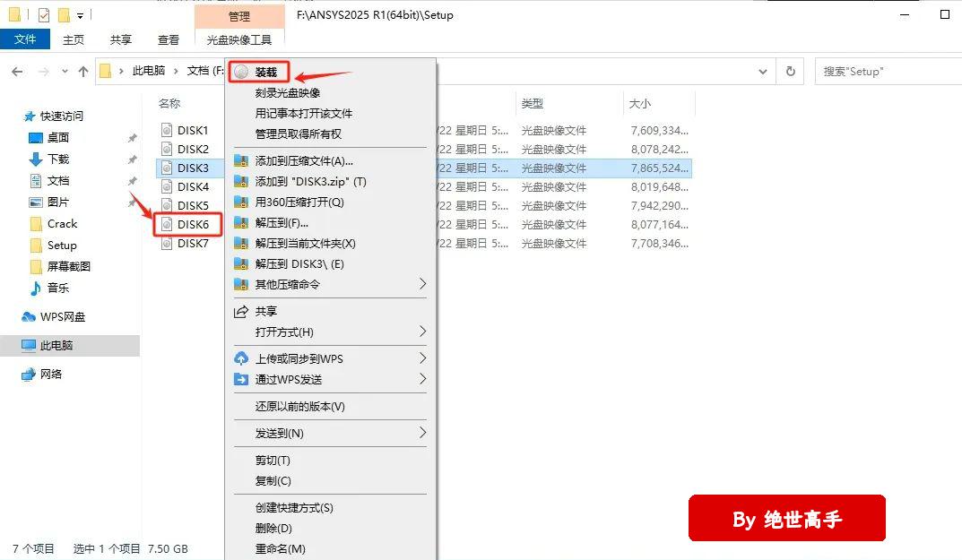 26、打开安装包【ANSYS2025 R1(64bit)】文件夹中【Setup】文件夹,鼠标右击【DISK1】选择【装载】。