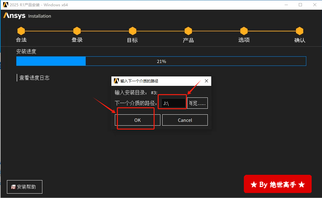 45、当安装进度到21%时,输入【DISK3】装载的磁盘(如:J),点击【OK】。