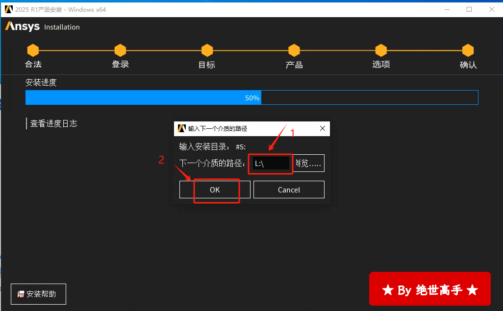 47、当安装进度到50%时,输入【DISK5】装载的磁盘(如:L),点击【OK】。