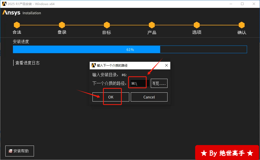 48、当安装进度到61%时,输入【DISK6】装载的磁盘(如:M),点击【OK】。