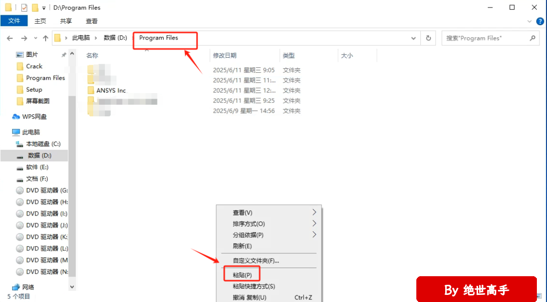 61、打开软件安装路径:如【D:\Program Files】,鼠标右击空白处选择【粘贴】。
