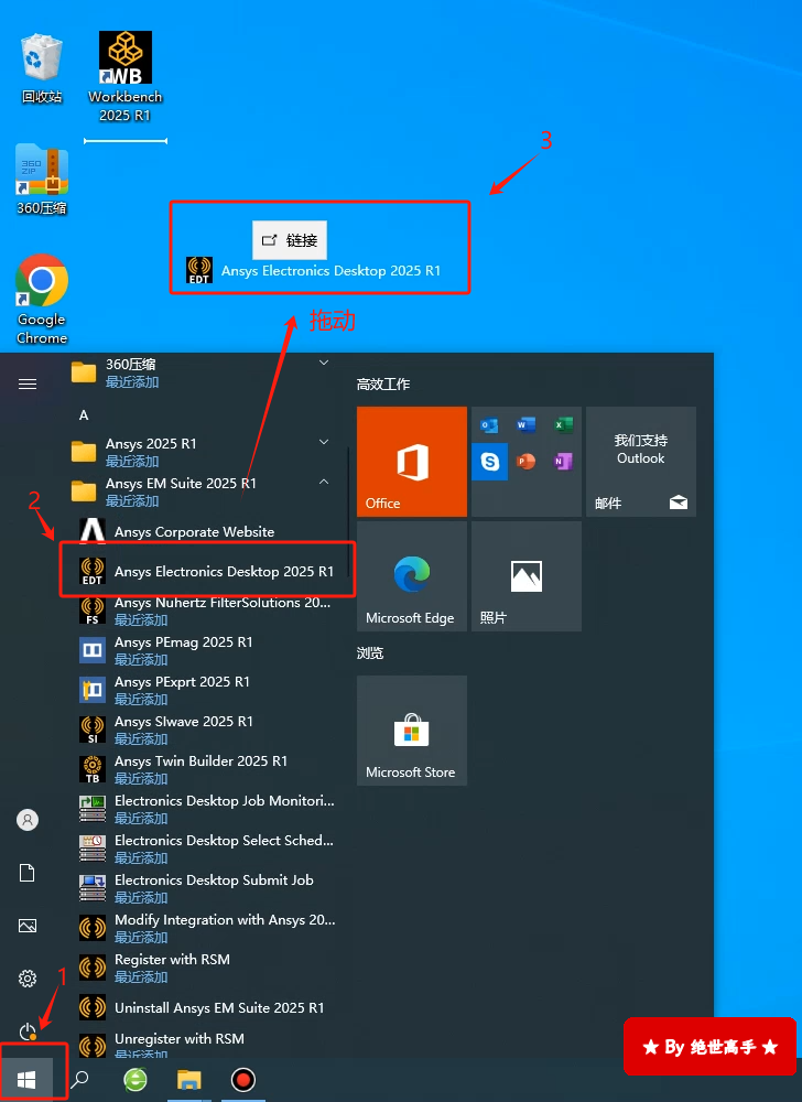 ①点击桌面任务栏中的【开始图标】>点击【所有应用】>双击展开【Ansys EM Suite 2025 R1】文件夹②将【Electronics】图标拖到电脑桌面。
