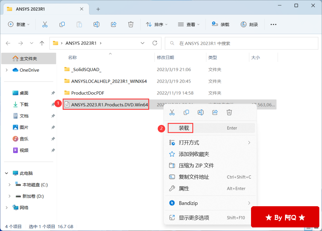 3、找到【ANSYS.2023.R1.Products.DVD】文件,右键点击【装载】