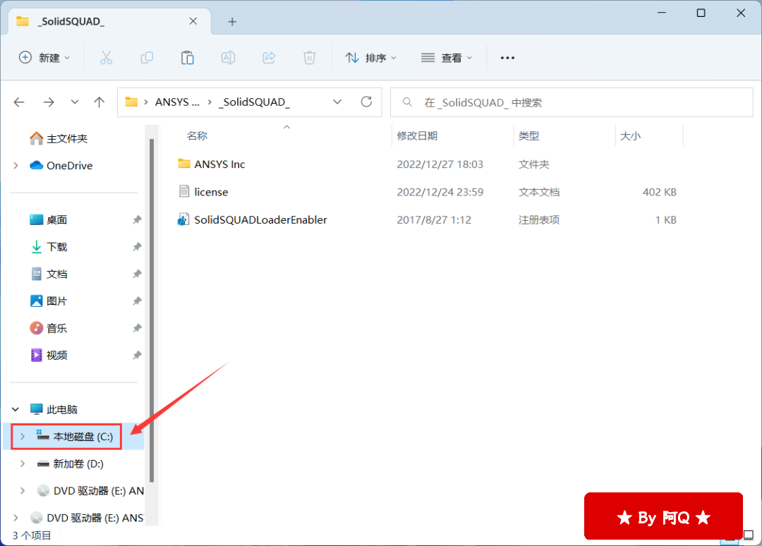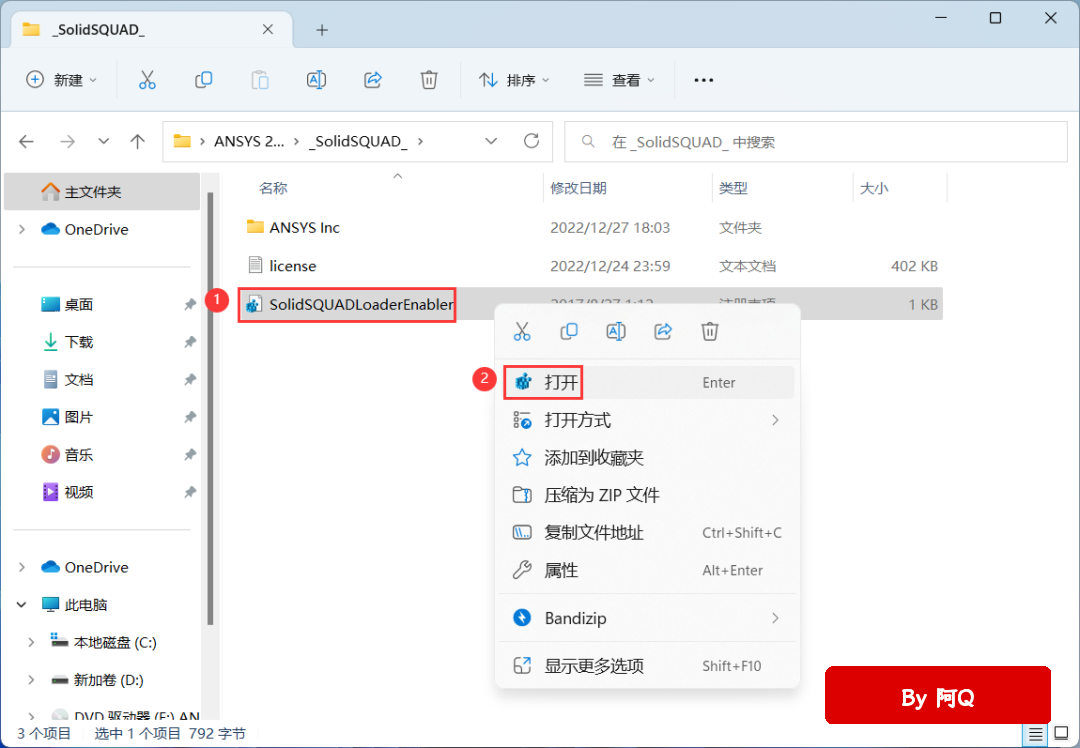 46、回到ANSYS 2023R1文件夹下的_SolidSQUAD_文件夹,找到【SolidSQUADLoaderEnabler】文件,右键【打开】它