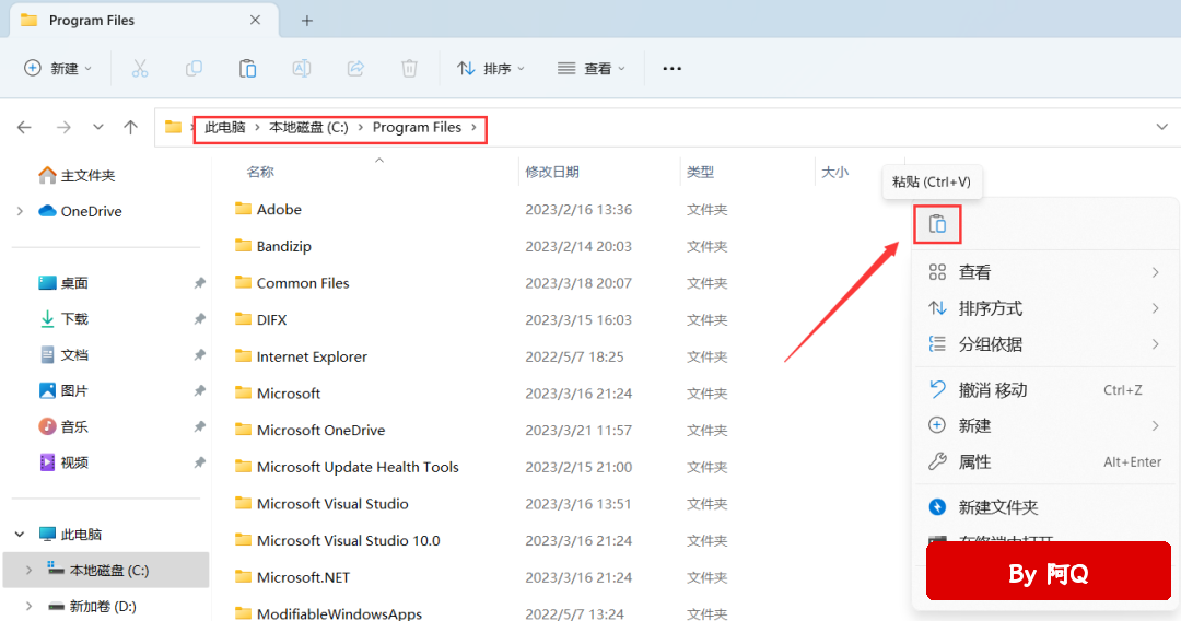 27、回到C盘下的Program Files文件夹,右键文件夹的空白处,点击【粘贴按钮】