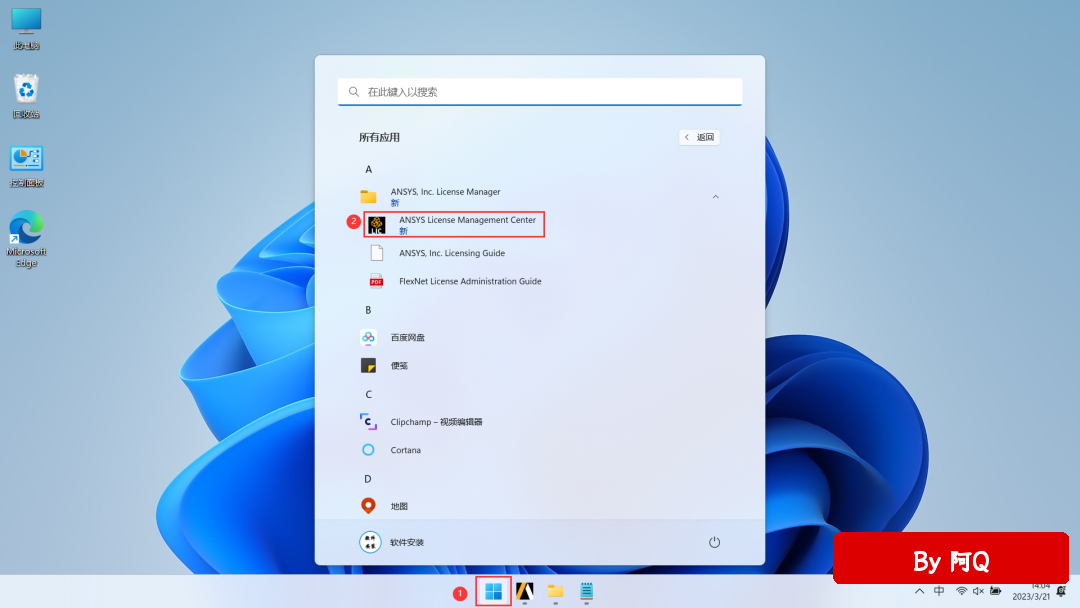 21、回到桌面,点击任务栏的【开始菜单】,在【所有应用】中找到【ANSYS Lincense…软件图标】,点击打开软件