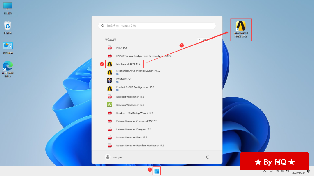 17、回到桌面,点击任务栏的【开始菜单】,在【所有应用】中找到【Mechanical APDL 17.2软件图标】,将软件图标拖到桌面上,完成软件桌面快捷方式的创建