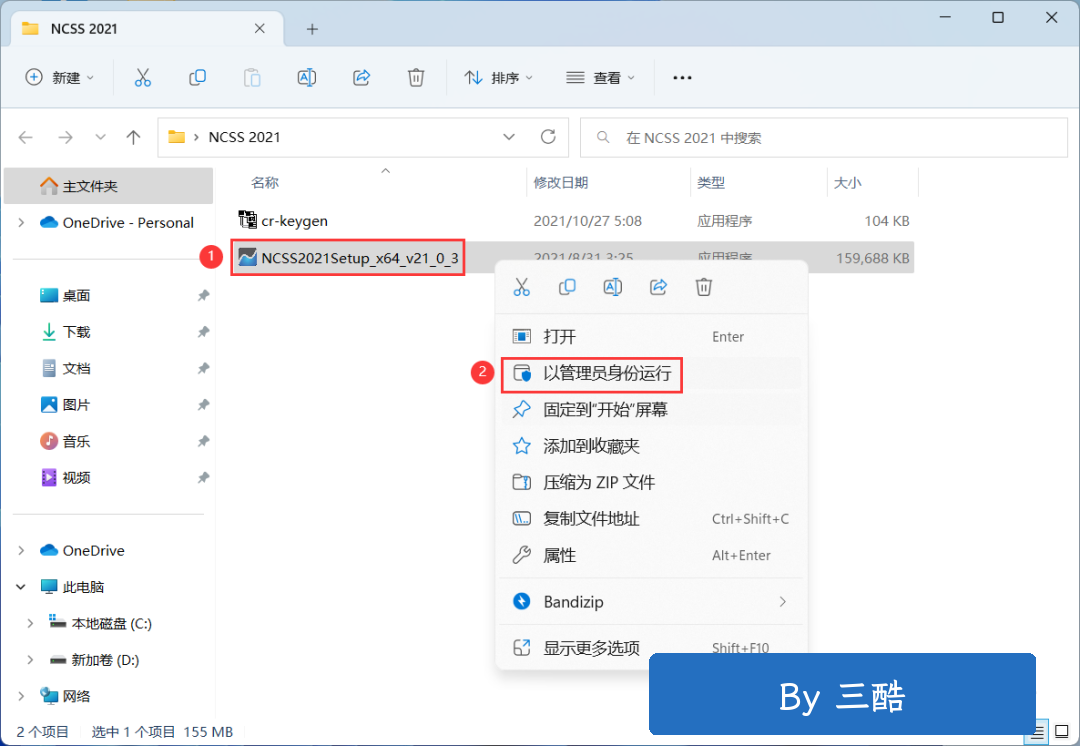 3、找到【NCSS2021Setup…】应用程序,右键选择【以管理员身份运行】它